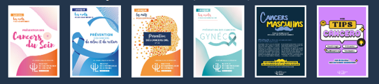 Cette collection rédigée dans un langage clair se décline sur la prévention des cancers du sein, des cancers du côlon et du rectum, des cancers ORL, des cancers gynécologiques ; une plaquette sur les cancers masculins et le livret Mes Tip’s Cancéro.